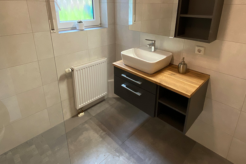 Das neue Bad bietet nun eine großzügige Walk-in-Dusche, kombiniert mit großformatigen Fliesen an Wand und Boden. Eine neue Waschtischanlage, moderne Armaturen und harmonische Lichtakzente runden das Raumkonzept ab. Die fugenarme Gestaltung sorgt für eine elegante Optik und reduziert den Reinigungsaufwand deutlich.
