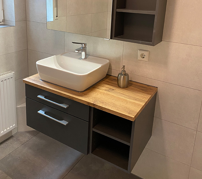 In diesem Projekt wurde ein in die Jahre gekommenes Badezimmer vollständig saniert und modernisiert. Ziel war es, den Raum funktionaler zu gestalten und gleichzeitig ein zeitloses, pflegeleichtes Design zu schaffen.