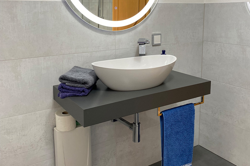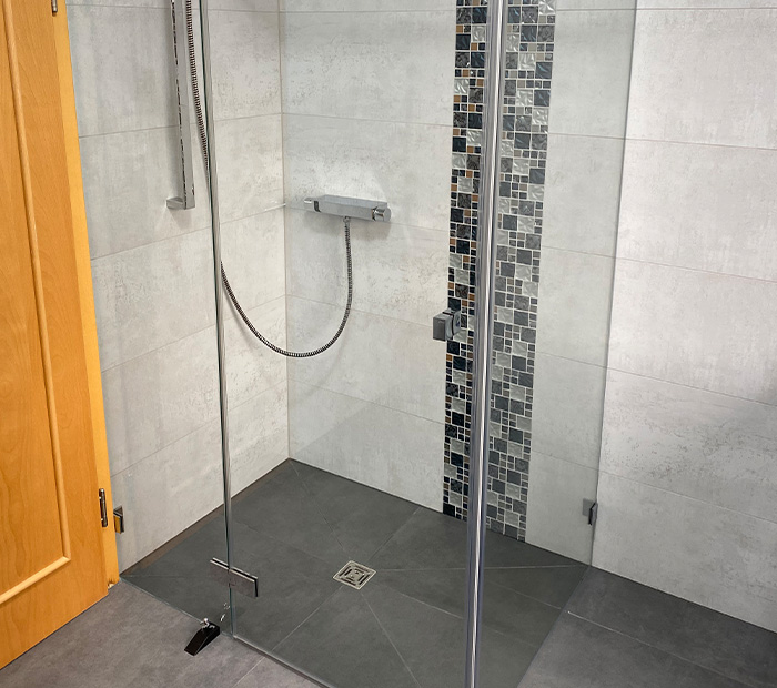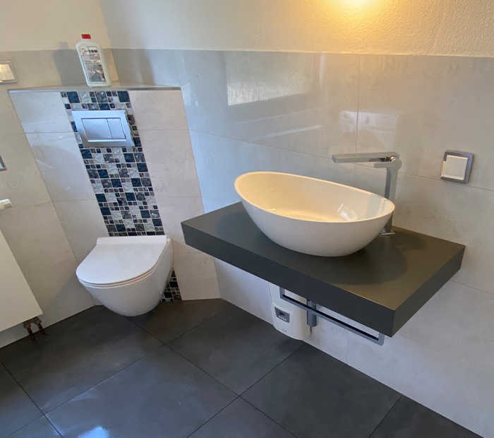 Dieses Bad wurde komplett modernisiert – mit dem Ziel, eine klare, offene Raumwirkung zu schaffen. Auf bewusst reduziertes Design gesetzt, verzichtete der Kunde auf zusätzliche Möbel oder Stauraumlösungen. Stattdessen liegt der Fokus auf großflächiger Gestaltung, ruhiger Farbgebung und hochwertiger Ausstattung.